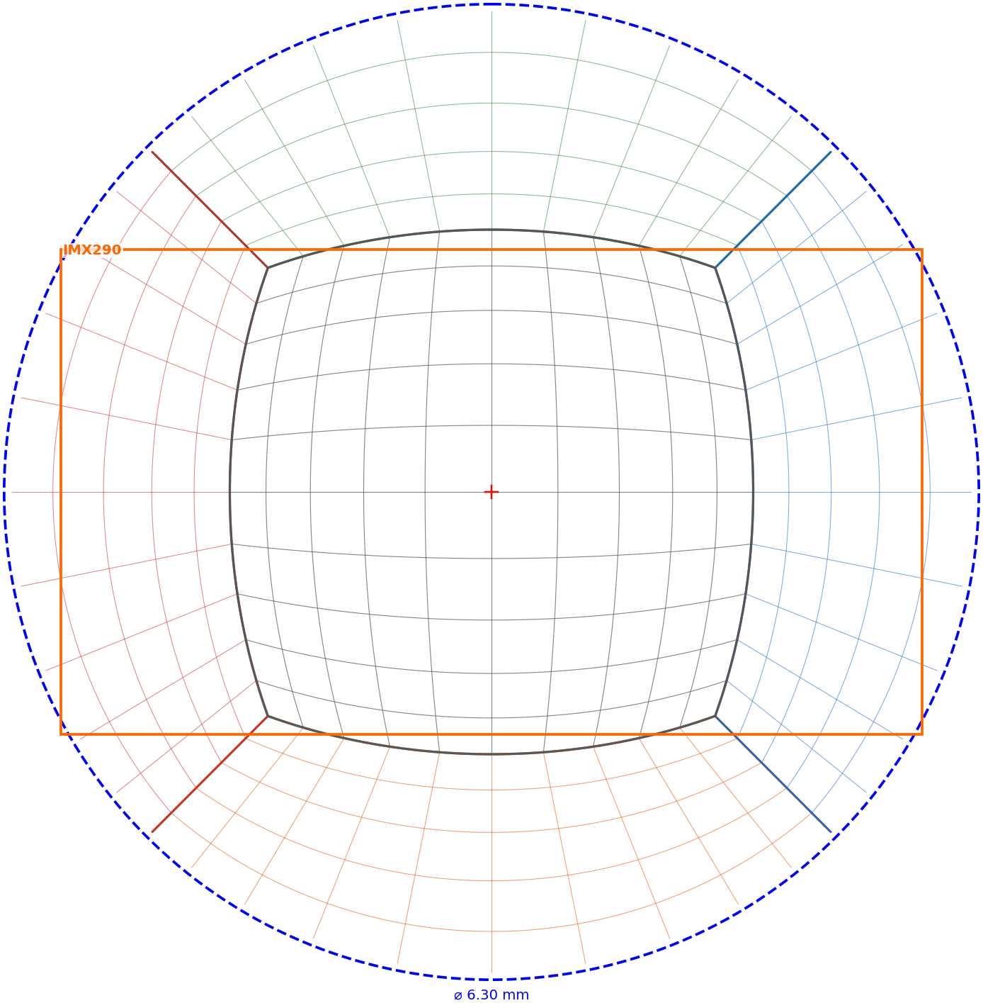 The panorama projection renders a full 360x180° equirectangular scene through the calibrated lens model, showing exactly what the camera would capture in a real environment. The image is generated by tracing rays from every pixel through the lens distortion model into the panorama, producing a geometrically accurate view that includes all barrel distortion, pincushion, and field curvature native to the optic. The image circle boundary marks the physical limit of the lens illumination - pixels outside it receive no light and are masked black. Sensor overlays drawn inside the circle show how much of the projected scene each sensor format actually captures, making it immediately obvious whether the sensor is under-filling or over-filling the image circle. Wide angle and fisheye lenses compress a large solid angle into the circle, pulling peripheral detail toward the edges where pixel density drops and distortion increases. Narrow lenses frame a smaller portion of the scene but preserve straight lines and uniform sampling across the field. The principal point crosshair marks the optical axis where resolution peaks and distortion is zero. Comparing this projection across different lens and sensor combinations reveals the practical tradeoff between field of view coverage and per-pixel fidelity - the same scene detail that fills dozens of pixels at image center may occupy only a few pixels near the circle edge, directly impacting detection and recognition capability at the periphery.