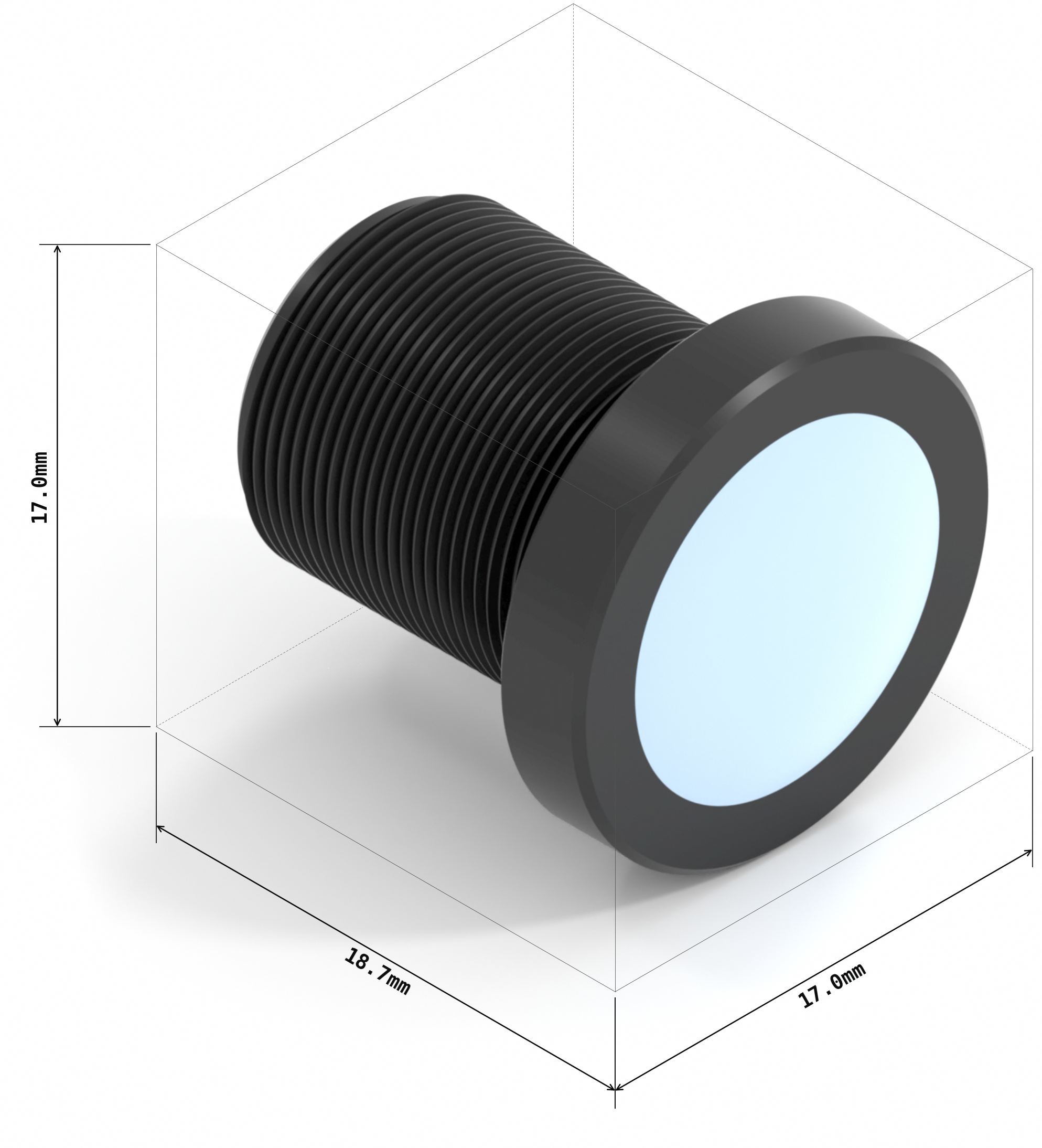The depth of field chart shows the near and far focus limits as a function of subject distance for a given f-number. The circle of confusion (CoC) defines the largest blur spot that still appears sharp in the final image. Here it is set at the Nyquist limit - twice the pixel pitch - which represents the smallest detail the sensor can physically resolve. Short focal length lenses produce inherently deep depth of field. In many cases the hyperfocal distance is well under one meter, meaning everything beyond that distance is acceptably sharp without refocusing. This is especially relevant for surveillance, machine vision, and multi camera rigs where active focus adjustment is impractical or undesirable.