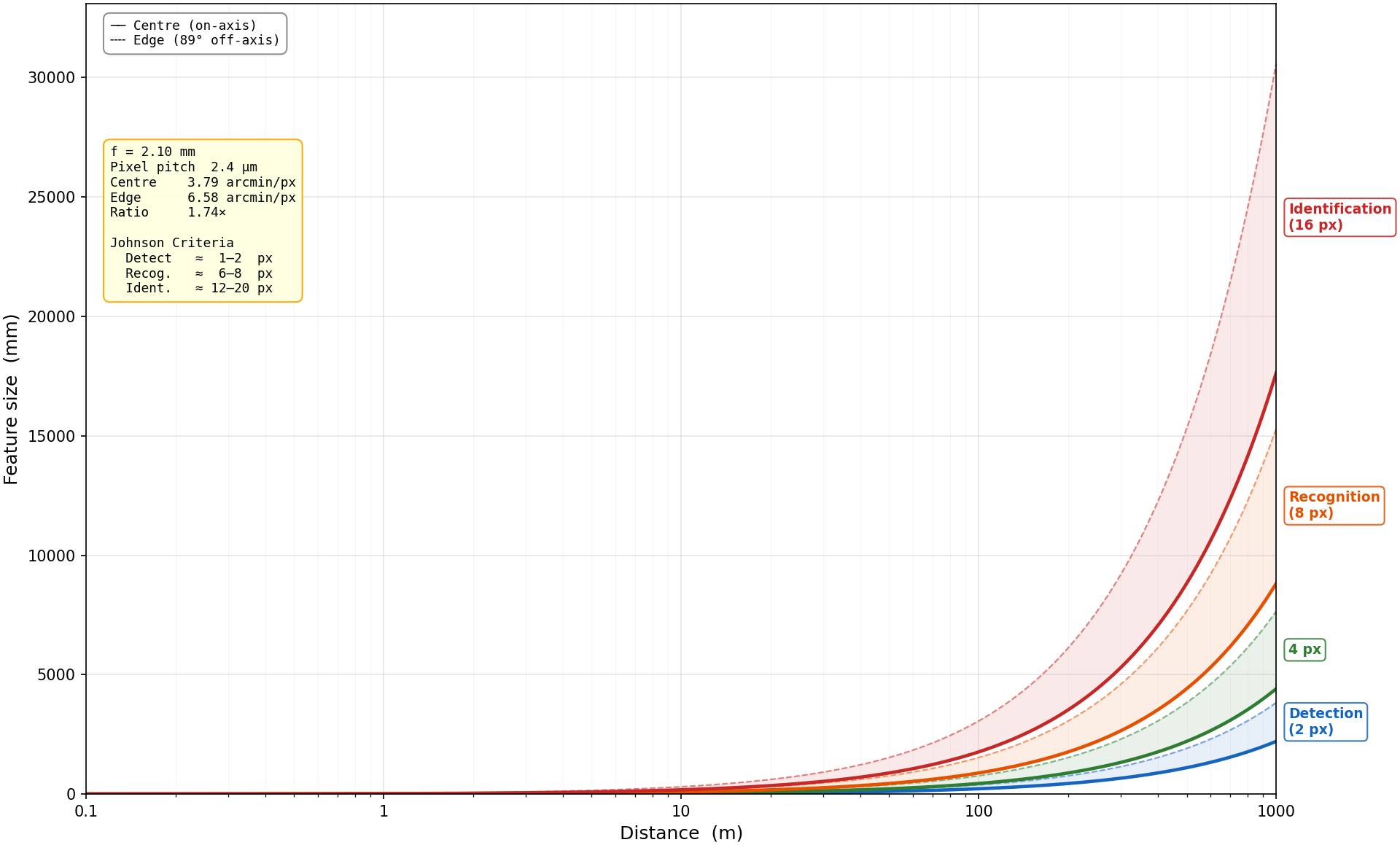 The GSD chart shows the minimum physical feature size that can be resolved as a function of distance for several pixel count thresholds. The relationship is linear - feature size grows proportionally with distance - but the log scaled distance axis reveals how quickly resolving power falls off at range. Each threshold corresponds to a tier from the Johnson criteria, widely used in surveillance and machine vision: detection (1-2 pixels) confirms that something is present, recognition (6-8 pixels) determines the class of object, and identification (12-20 pixels) distinguishes one specific object from another. For each threshold the chart shows two lines: the center of the image circle where angular resolution is highest, and the edge where it degrades. Short focal length lenses cover wide fields of view but sacrifice per pixel resolving power at distance. Long focal length lenses push the detection and identification envelopes much further but see a narrower scene. This tradeoff is fundamental when selecting optics for a given working distance - the chart makes it possible to read off directly whether a lens can detect a 1mm defect at 5meters or identify a person at 200meters.